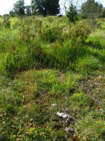 Contraste entre la riche pelouse rase sur affleurement rocheux (moitié inférieure de la photo) et l’ourlet dense à Brachypode à l’arrière-plan, déjà piqueté de touffes de Brande, qui annoncent l’édification d’un fourré signifiant à terme l’extinction de la pelouse et des espèces qui lui sont liées.