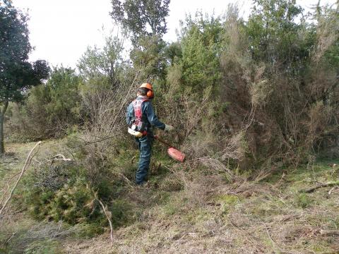 Depuis la signature du bail emphytéotique, le Conservatoire d'Espaces Naturels (CREN) a entamé une réouverture des pelouses sèches et des secteurs très embroussaillés. Très rapidement s’est posée la question du devenir des produits de coupe issus notamment des chantiers réalisés soit par le Service Insertion Environnement (SIE) soit en collaboration avec le Lycée Agricole de Saintes. Une mise en déchèterie de l’ensemble des produits n’était pas satisfaisante. Dès 2008, le CEN a profité d’un projet expérimental sur 3 ans lancé par la Chambre d’Agriculture de la Charente Maritime sur l’utilisation de broyage très grossier de branche ou Bois Raméal Fragmenté (BRF) déposé sur les cultures d’exploitants agricoles. Dans ce cadre, la chambre d’Agriculture prenait en charge les frais de broyage et d’enlèvement des produits pour les diriger vers une exploitation sur Champdolent. Cette expérimentation a permis l’enlèvement d’environ 100 m3 de matière broyée. En 2011 et suite à la fin de cette expérimentation, le CREN entre en relation avec Mr ARRIGNON, exploitant agricole à St Sulpice d’Arnoult et intéressé pour utiliser ce broyage sur ces cultures. Dans ce cadre, un Contrat Natura 2000 financé par la DREAL et l’Europe prend en charge le broyage des branches et arbustes coupés par le Lycée Agricole de Saintes jusqu’en 2014, Mr ARRIGNON s’occupant du transport des végétaux broyés.